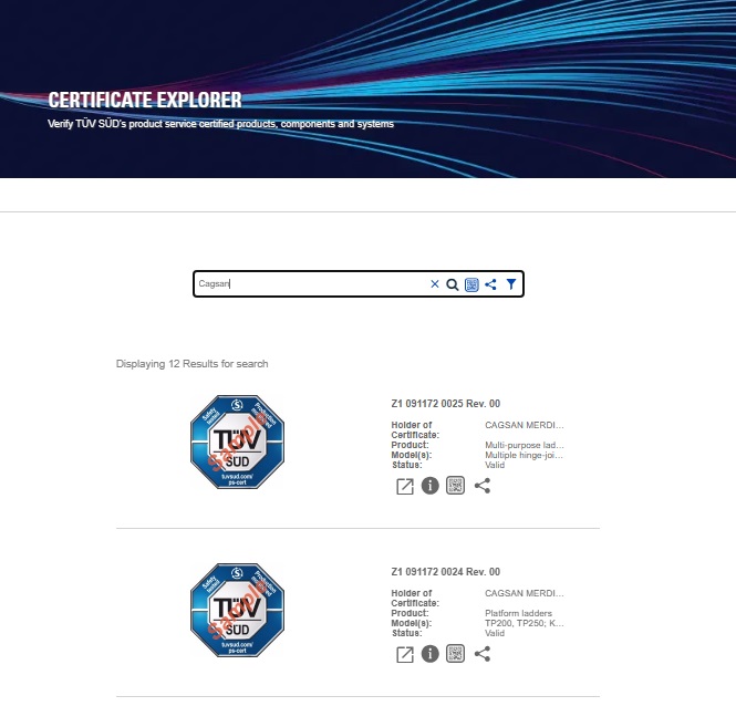 Proizvodi CAGSAN kompanije potvrdjuju svoju dugotrajnost i izdrzljivost vrhunskim sertifikatima kvaliteta.Sva ispitivanja i eksperimenti na proizvodima obavljaju se po najvišim standardima, a rezučtat su vrhunski proizvodi iz serije ProTUBE aluminijskih skela. Ovaj sertifikat pokriva proizvod izrađene od montažnih elemenata, a ispituju se materijali, dimenzije, dizajn opterećenja, sigurnost i zahtevi za vrhunske performanse. Po izdavanju sertifikata i proizvod je osiguran od strane TSE brenda.